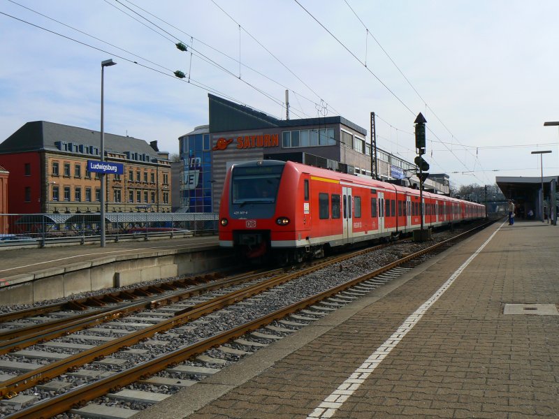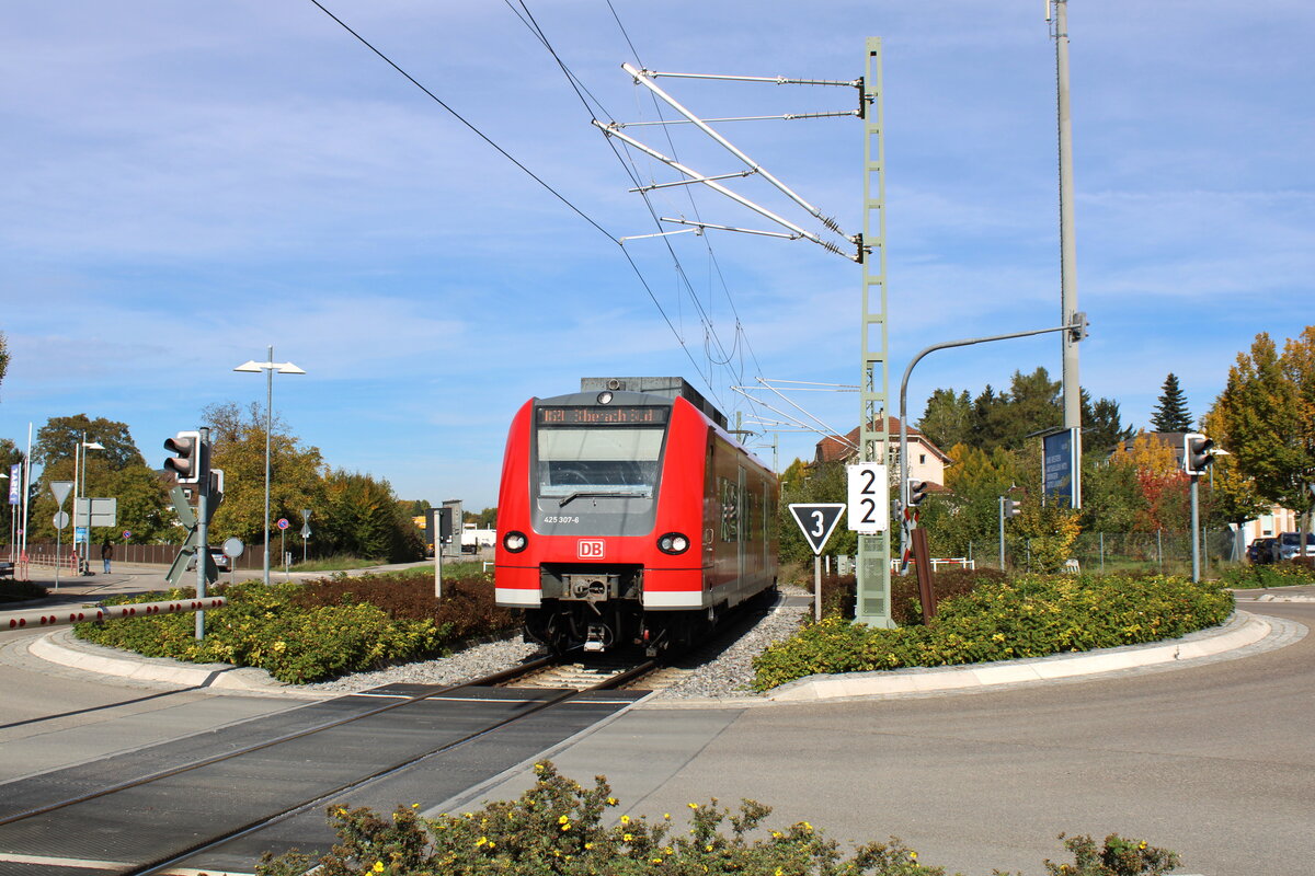 Ein sehr interessanter Bahnübergang bietet der Bahnhof Laupheim Stadt. Den in einem Kreisverkehr gelegenen eingleisigen Streckenabschnitt passiert DB 425 307-6 als RS21 zur Fahrt nach Biberach(Riß)Süd. (04.10.2022) OMSIJakob LP