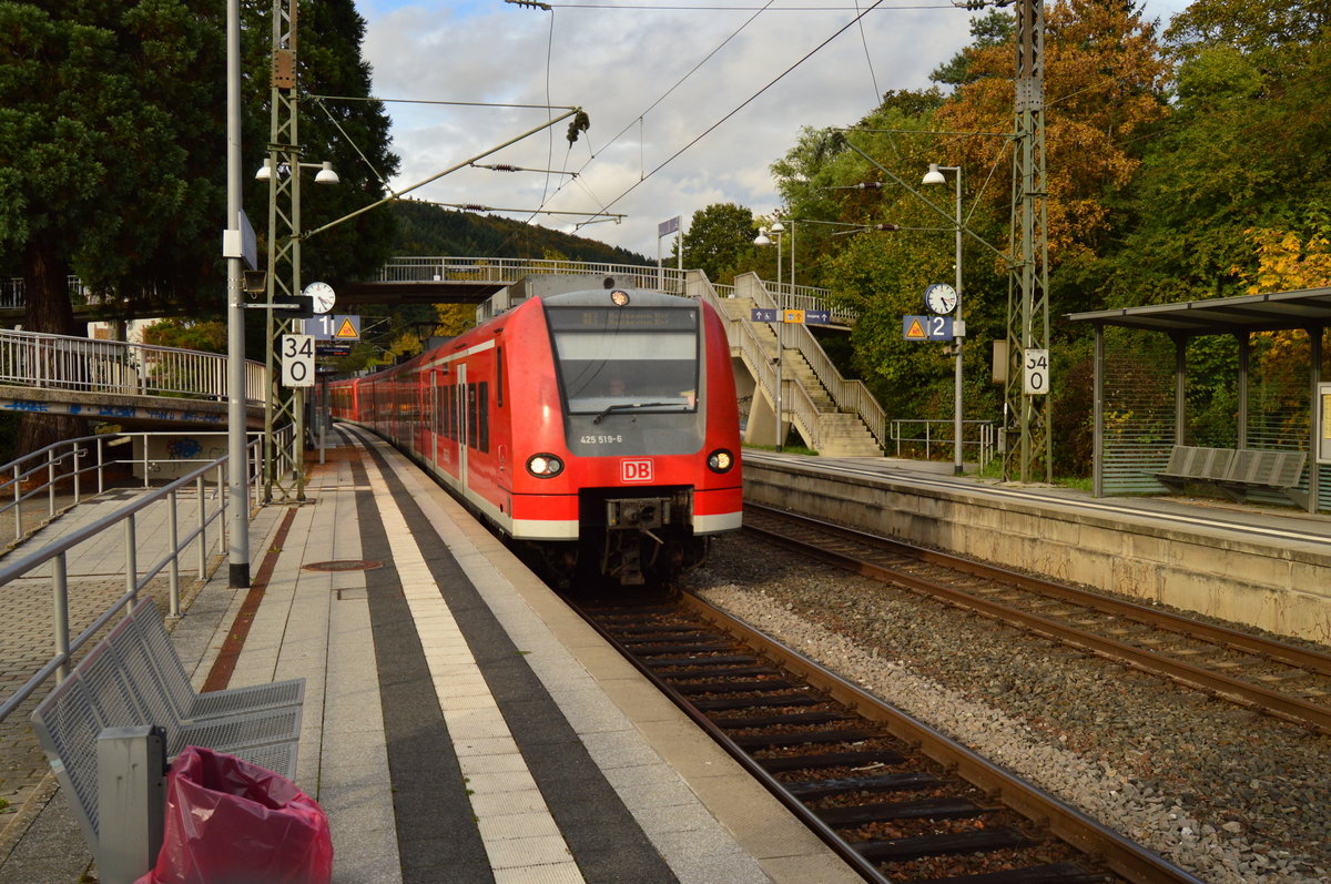 Durch fahrt eines RE3 nach Heilbronn, der vom 425 519-6 geführt wird. Neckargerach den 15.10.2016