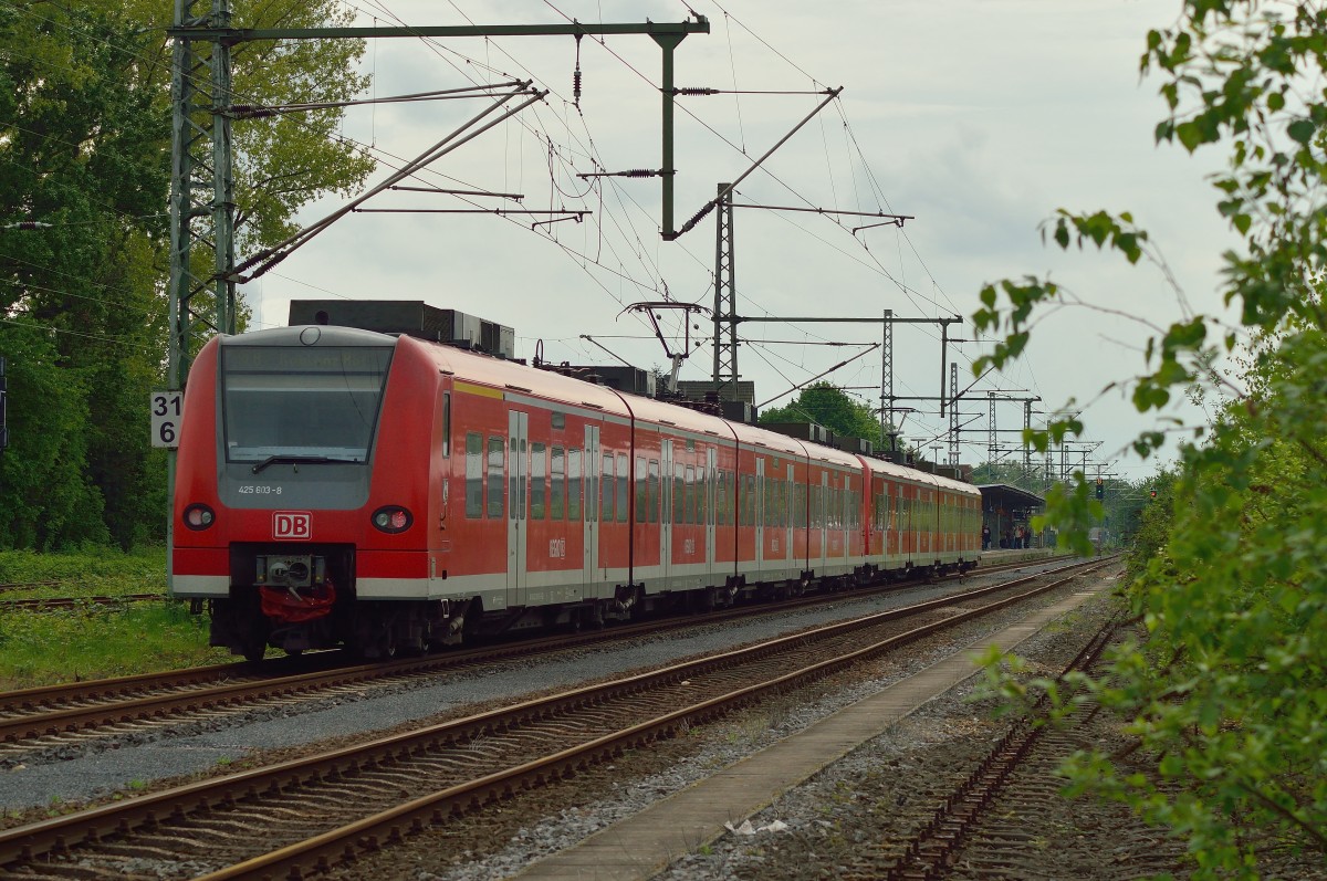RE 8 nach Koblenz am Bahnübergang Jüchener Mühle / Friedhofstraße am Sonntag den 20.6.2010. Einige Sekunden zuvor hat der Zug den HP Jüchen verlassen und fährt zum nächsten Halt Grevenbroich. Das Bild zeigt die Triebwagen 425 603-8 + 425 100-4. Andreas Strobel
