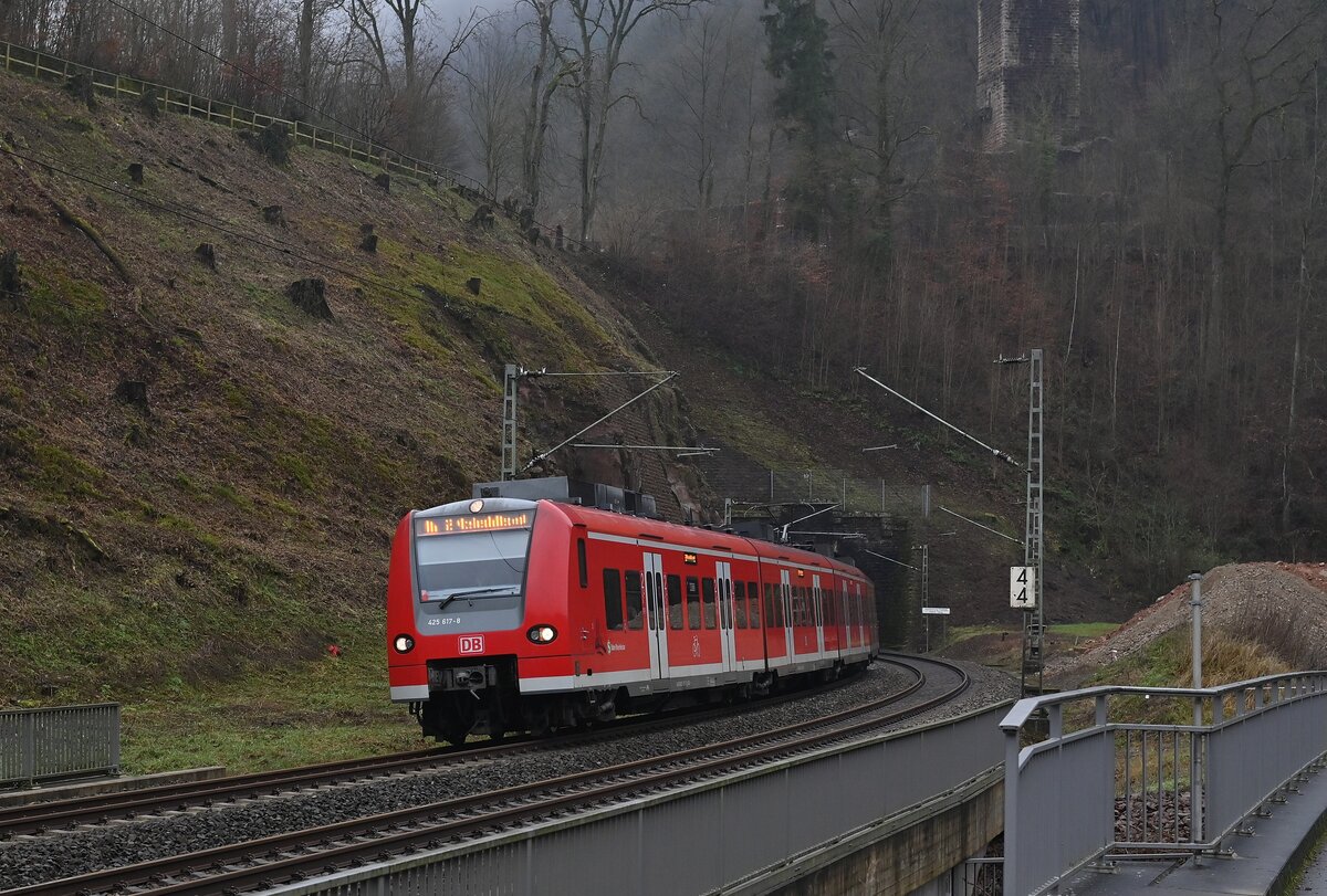 Begegnung zweier Triebwagen der Baureihe 425 die als S2 beziehungsweise S1 gerade in Neckargerach sind, wobei der 425 617-8 gerade einfährt und der auf dem rechten Gleis gen Binau unterwegs ist.18.7.2020 Andreas Strobel