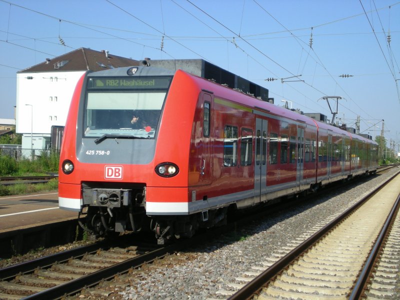 Der 425 758-0 verläßt am 26.09.2008 um 11:18 Uhr den Bahnhof Mannheim-Rheiaus als RB nach Waghäusel.