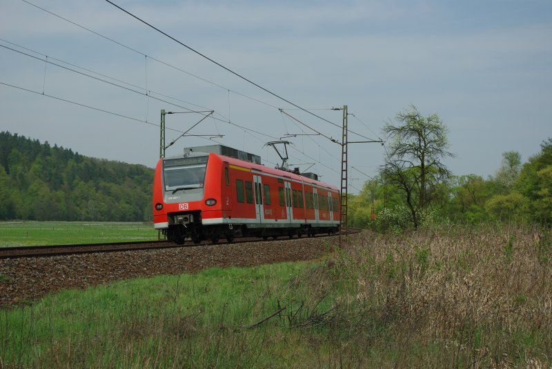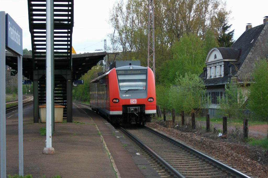 Am 26.04.2010 hat 426 007-1 Ausfahrt aus dem Bahnhof Friedrichthal mit Ziel St. Wendel. Rechts ist das ehemalige Empfangsgebäude zu sehen, das in den Hang hinein gebaut wurde. Am Jahr 2012 stand das Bahnhofsgebäude zur Versteigerung.