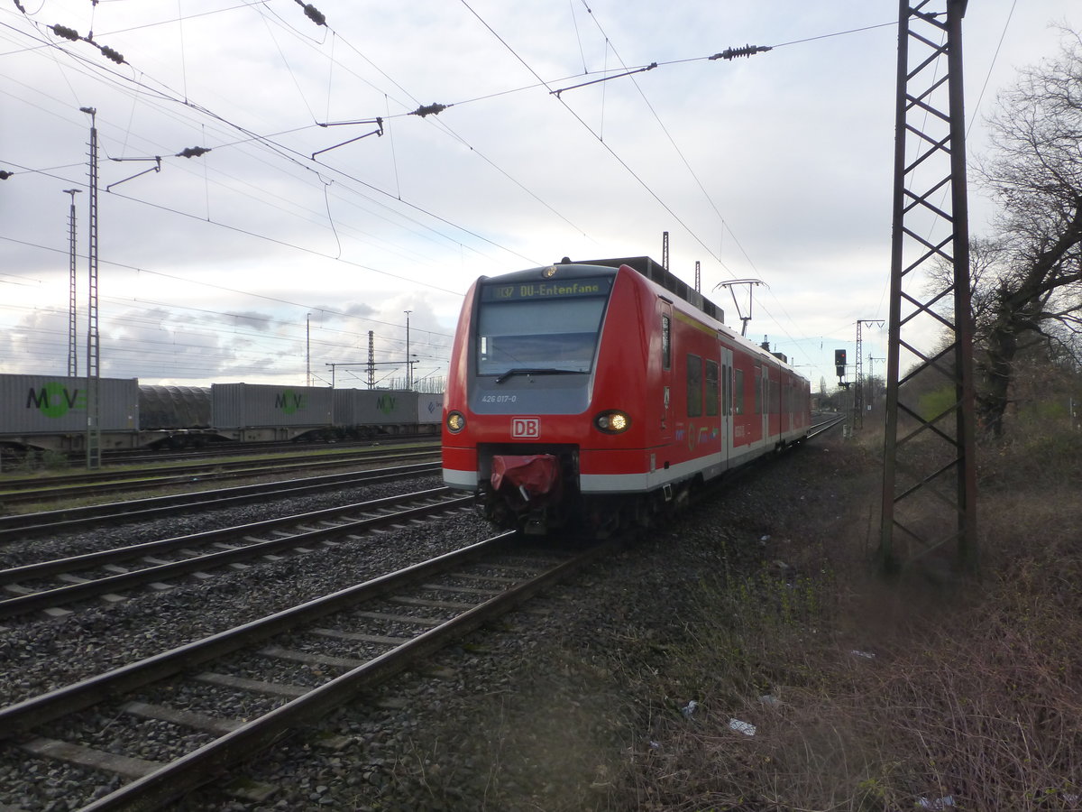 426 017-0 als RB37 nach Duisburg-Entenfang, bei der Einfahrt in den HP Duisburg-Bissingheim, an seinem letzten Einsatztag vor dem Schienenersatzverkehr, der bis Ende August 2019 den RB37 befahren wird. Aufgenommen am 17.03.19.