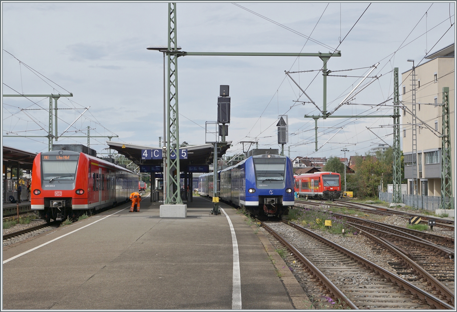 Friedrichshafen Stadtbahnhof im Laufe der Zeit: Erneut ein Zeitsprung, wenn auch im Verhältnis zu vorhergehenden weitaus kürzer, um so einschneidender jedoch die Veränderungen! Der Fahrdraht hat von Ulm und Lindau kommend Friedrichshafen erreicht, folglich wickelt sich der Zugsverkehr hauptsächlich mit elektrischer Traktion ab. Erneut stehen zwischen zwei DB-roten Zügen ein blauer BOB Triebzug: links im Bild wartet der aus Lindau Insel in Friedrichshafen angekommene DB 425 305 auf die Weiterfahrt nach Ulm, der blaue BOB 426 034-4 wird zusammen mit dem nicht zu sehenden 426 536-9 als RB91 / 87569 zum Hafenbahnhof fahren und einige DB VT 650 sind rechts im Bild abgestellt.