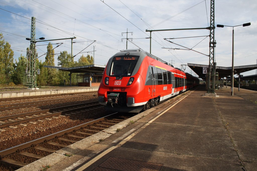 Hier 442 121-0 und 442 129-3 als RB22 (RB28813) von Berlin Schönefeld Flughafen nach Potdam Hbf., bei der Ausfahrt am 3.10.2012 aus Berlin Schönefeld Flughafen. Alexander