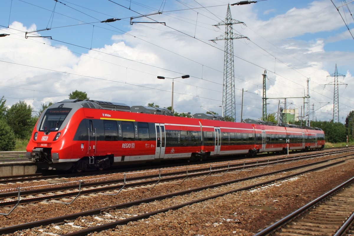 Hier 442 328-1  Wildau  als RE7 (RE18720)  Airport-Express  von Bad Belzig nach Berlin Schönefeld Flughafen, bei der Einfahrt am 14.6.2014 in Berlin Schönefeld Flughafen.
