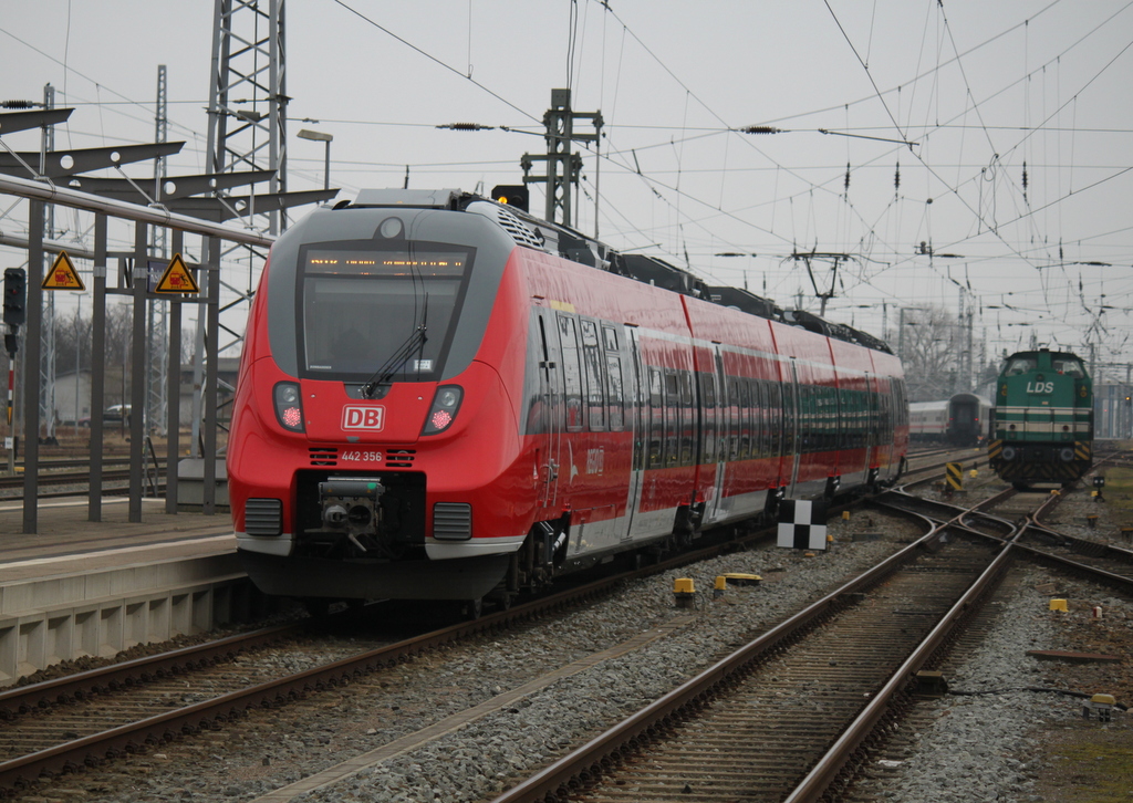 442 356-2 als RB 12(RB 13261)von Rostock Hbf nach Ribnitz-Damgarten West bei der Ausfahrt im Rostocker Hbf.im Hintergrund fuhr der Leerpark IC 2238(Leipzig-Rostock)in die Abstellung.