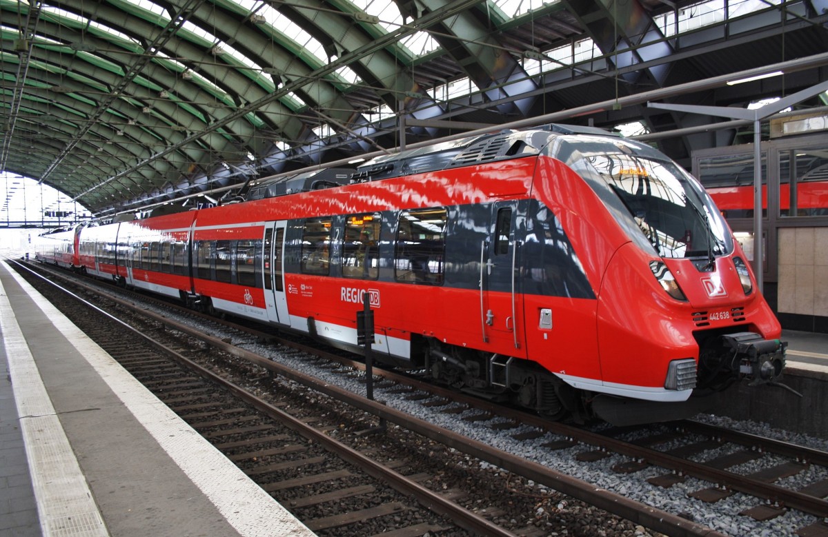 Hier 442 638-3 als Leerzug von Berlin Lichtenberg nach Berlin Schönefeld Flughafen, bei der Einfahrt am 14.7.2014 in Berlin Schönefeld Flughafen. Dieser Triebzug wird den kommenden RE7 (RE18725) "Airport-Express" von Wünsdorf-Waldstadt nach Dessau Hbf. auf dem Teilstück bis Bad Belzig verstärken. Alexander