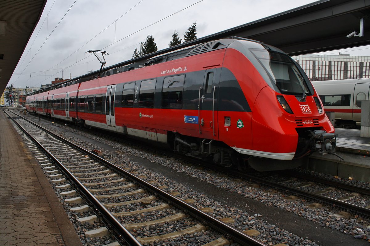 442 724-1 / 442 224-2 und ein weiterer ET 442 erreichen am 26. Juli 2014 als S1 nach Bamberg den Bahnhof Eggolsheim.