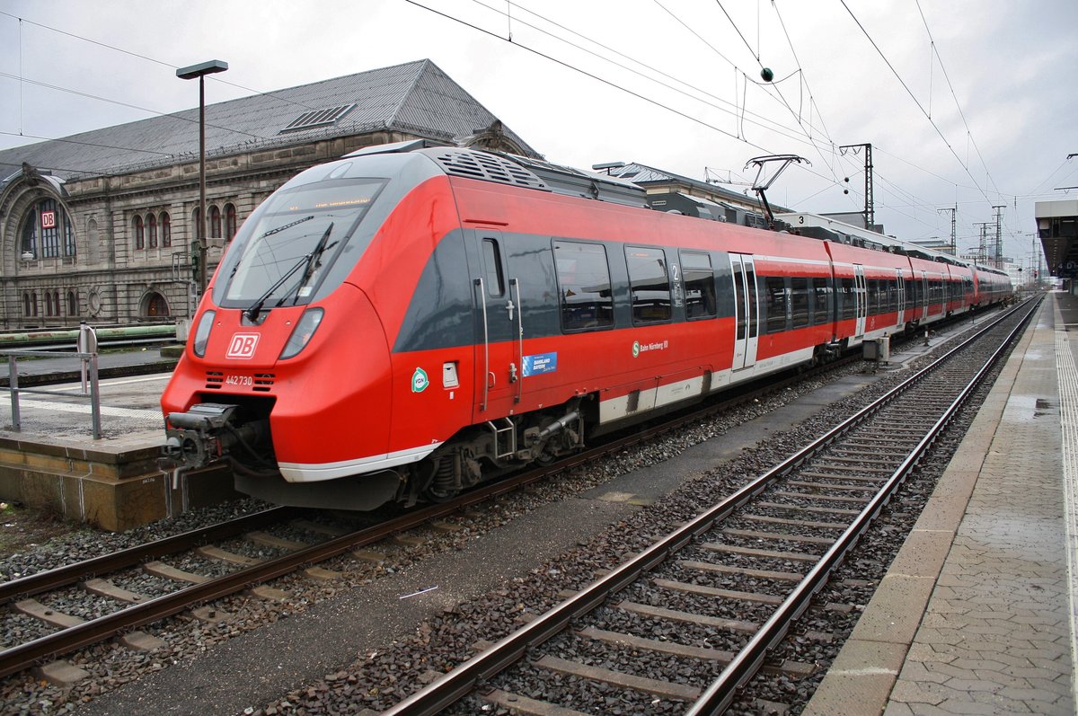 442 730-8 erreicht am 28.12.2017 als S1 von Forchheim(Oberfr) nach Hartmannshof den Nürnberger Hauptbahnhof.