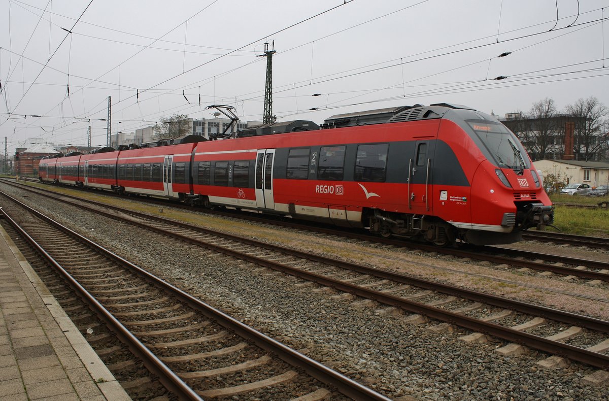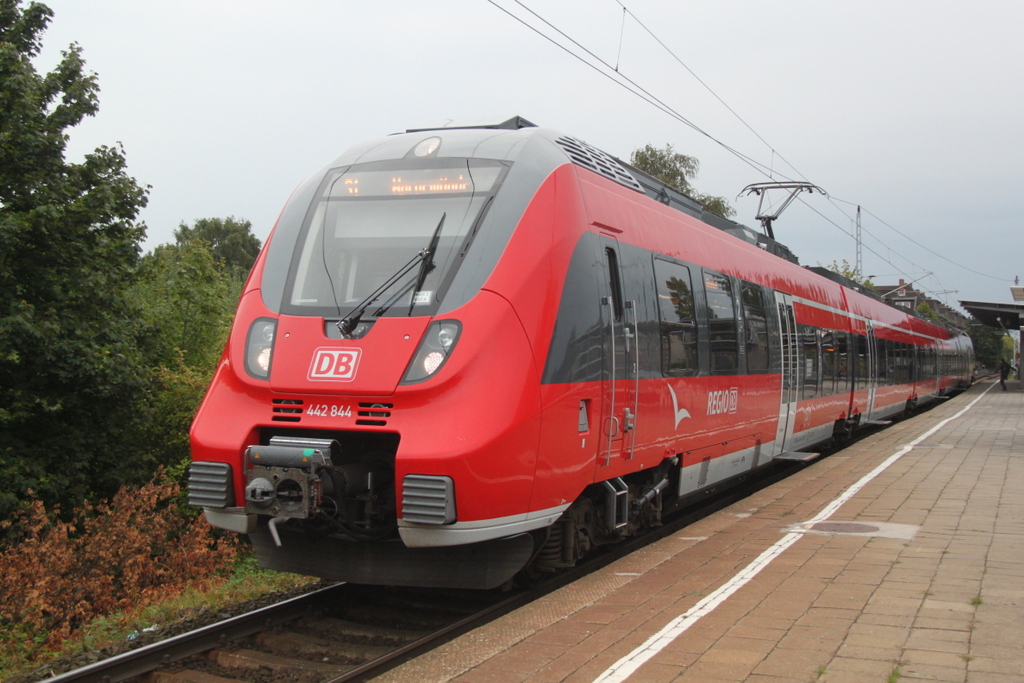 442 844-7 als S1 von Rostock Hbf nach Warnemünde stand am Morgen des 11.09.2015 wegen Hp0 Signal etwas länger im Haltepunkt Rostock-Holbeinplatz. Stefan Pavel