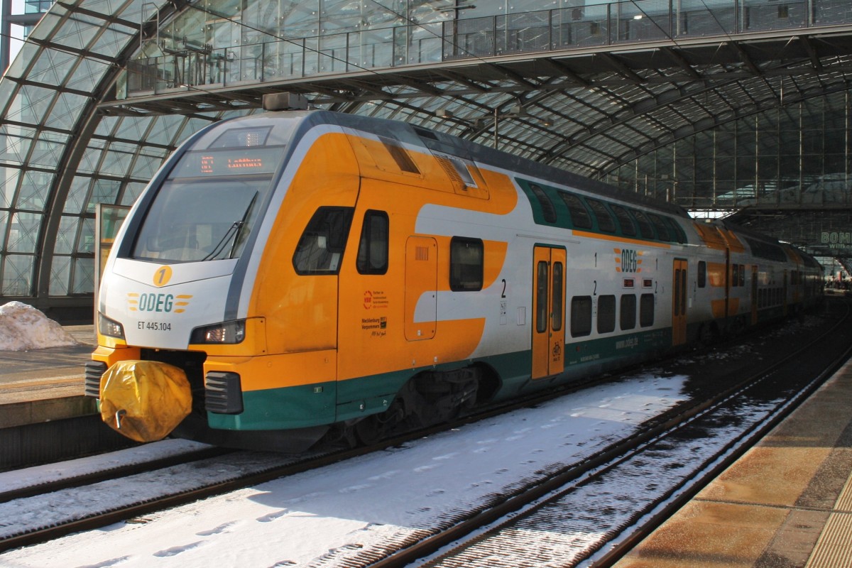445 104-3 (Stadler KISS) der Ostdeutschen Eisenbahn GmbH (ODEG) als RE 92978 (RE2) nach Cottbus Hbf steht in seinem Startbahnhof Berlin-Lichtenberg auf Gleis 20.