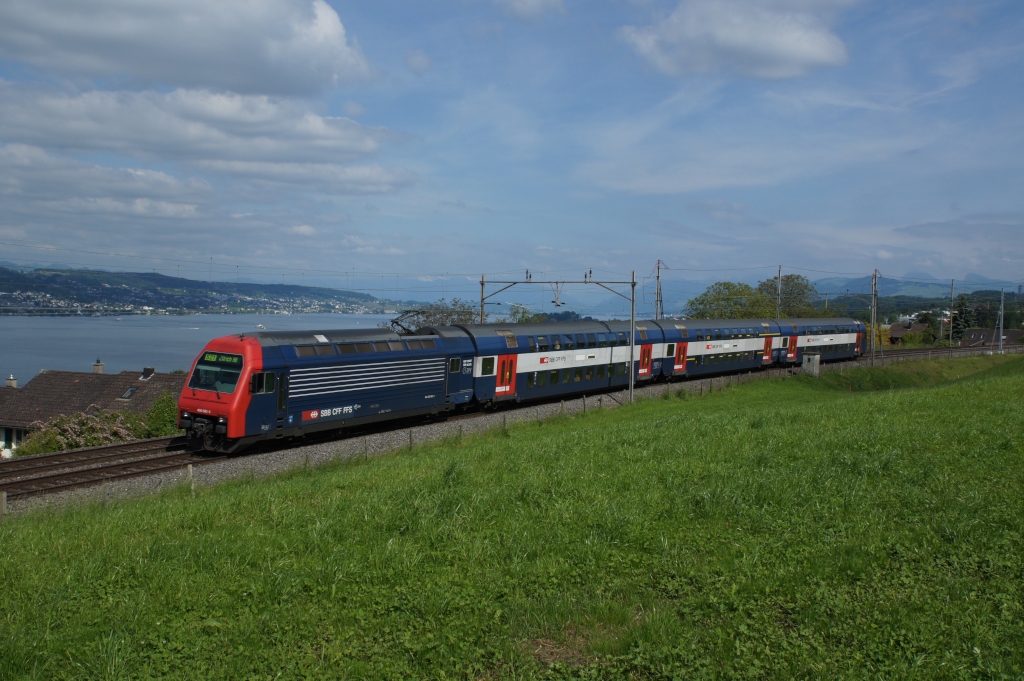 Re 450 082-3 verlässt am 04.06.2013 mit einer S 21 Horgen Oberdorf in Richtung Thalwil.
