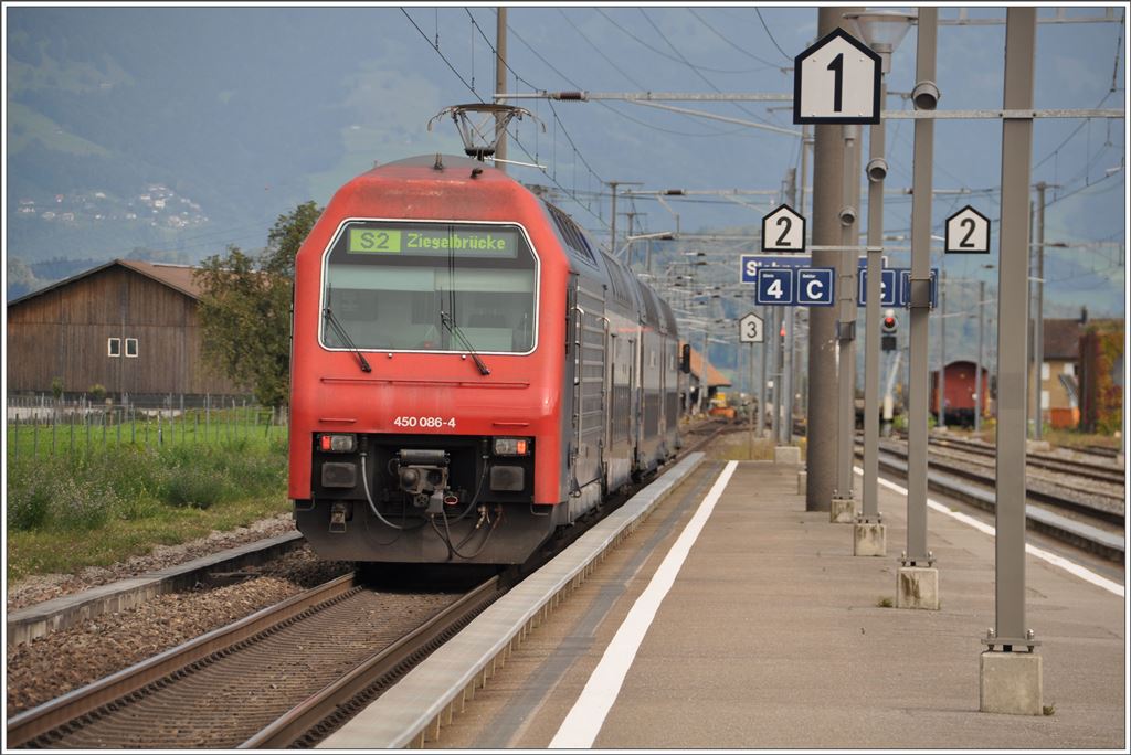 Bilder aus der March zwischen Pfäffikon SZ und Ziegelbrücke. S2 18235 mit 450 086-4 in Siebnen-Wangen. (24.09.2015)