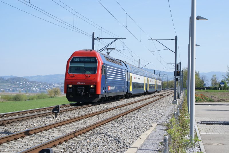 Die Komposition der S5 mit der Re 450 088-0 bewältigt am 27.4.08 das letzte Stück des Seedamms, um dann das Ziel in Pfäffikon zu erreichen. Sandro Gadola