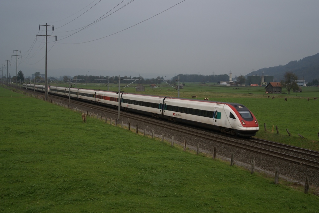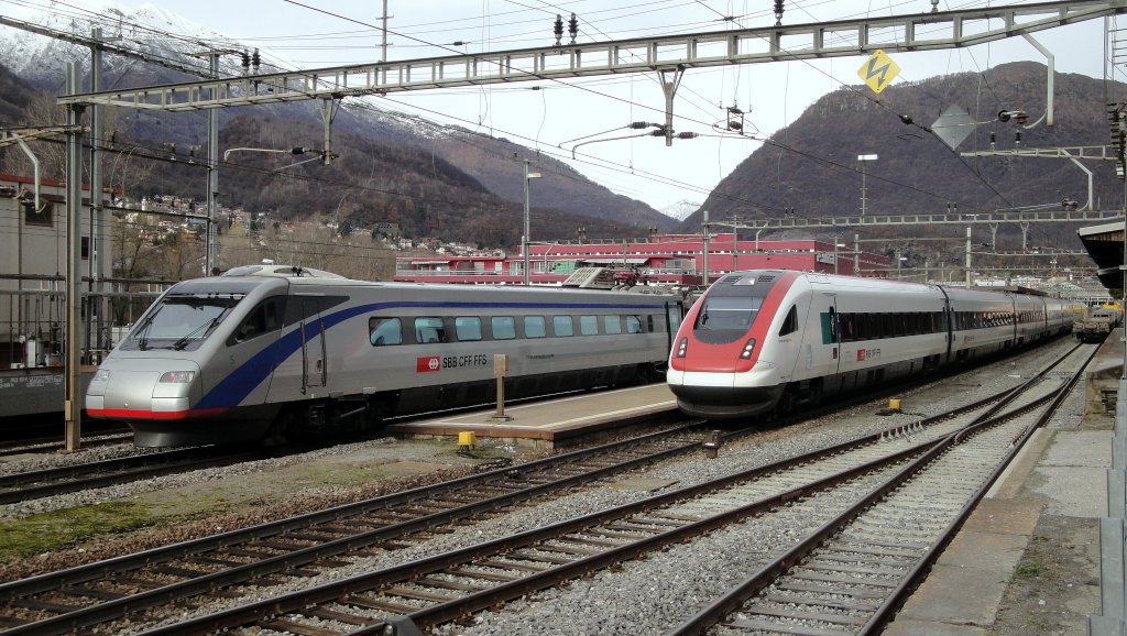 Der sowieso bereits als EC-Ersatz verkehrende ICN RABDe 500 013-8 "Denis de Rougemont" legt am 29.11.12 in Taverne-Torricella neben dem Pannenzug ETR 470 005 einen kurzen Diensthalt ein, um (so habe ich vernommen) das Zugpersonal richtung Chiasso zu befördern. Gabriel Hofer