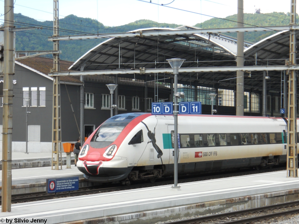 Zuerst fürchtet ich, Schmierfinken hätten einen ICN verunstaltet, dann aber begriff ich, das dies das neue Clown Gesicht des ICN RABDe 500 037-7  Gorck  ist, welches auf ein Zirkusfestival in Genève hinlächelt.