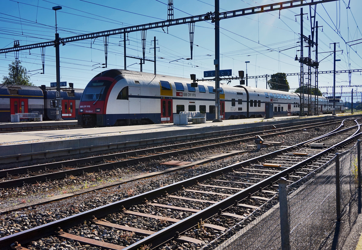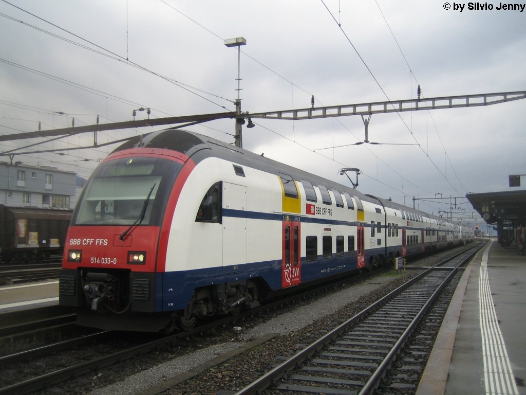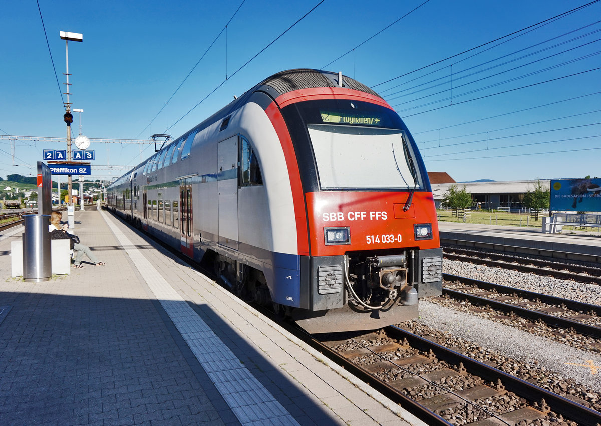 RABe 514 033-0 fährt als S2 18232 (Ziegelbrücke - Zürich HB - Zürich Flughafen), in den Bahnhof Pfäffikon SZ ein.