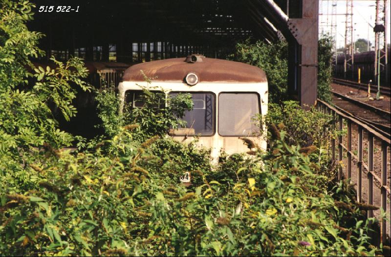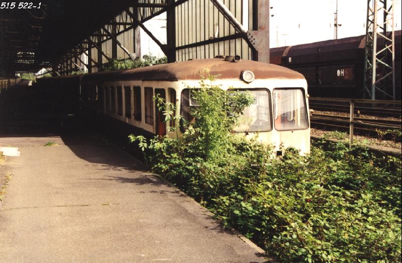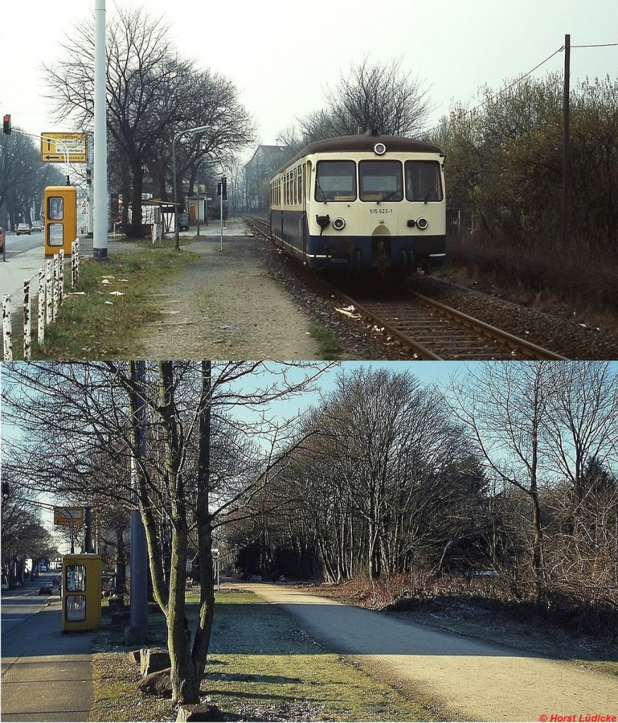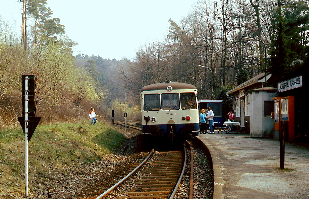 Auf seiner Fahrt von Wuppertal-Steinbeck nach Wuppertal-Cronenberg legt 515 522-1 um 1985 einen kurzen Halt in Wuppertal-Burgholz ein. Das dortige Ausflugslokal war schon immer ein beliebtes Ausflugsziel, heute leider nicht mehr für Bahnfotografen, sondern nur noch für Radfahrer, denn auf der Trasse führt jetzt ein Radweg entlang.