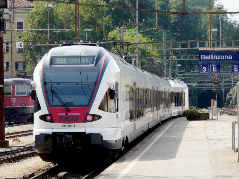 TILO - ( SBB+FS ) Triebwagen RABe 524 001-5 bei der ausfahrt aus dem Bahnhof von Bellinzona nach Locarno am 18.09.2008