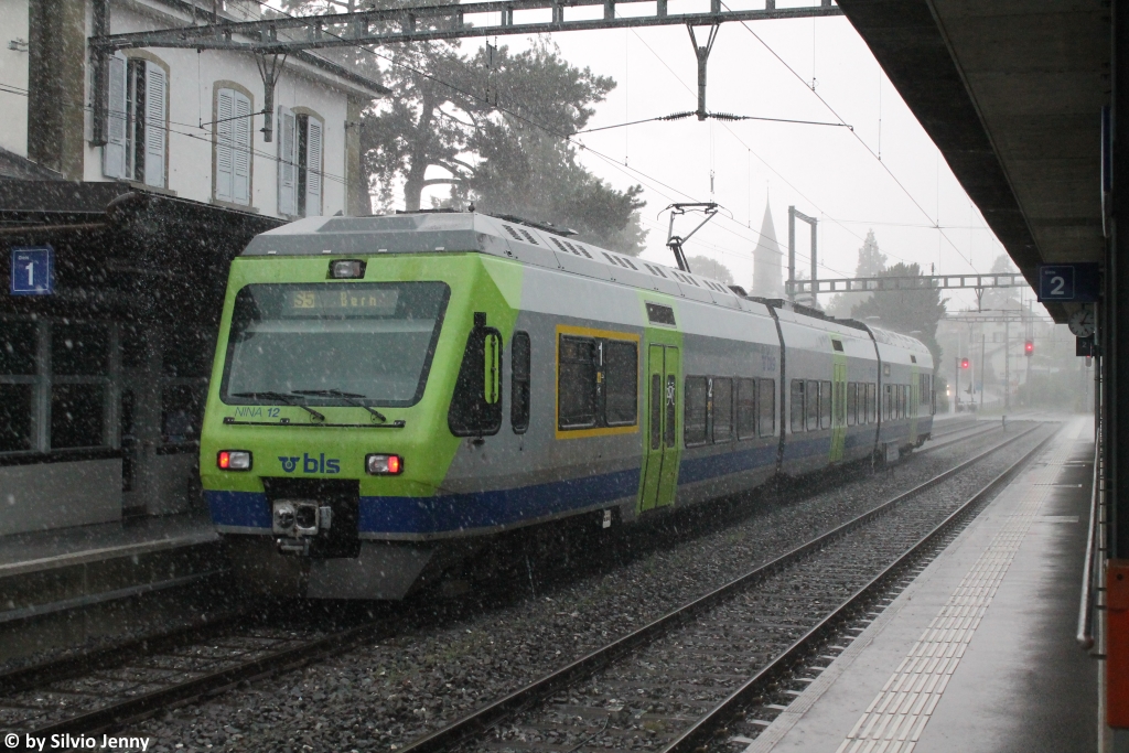 RABe 525 012-1 am 31.7.2016 während einem heftigen Platz-Regen in Murten/Morat als S5 nach Bern