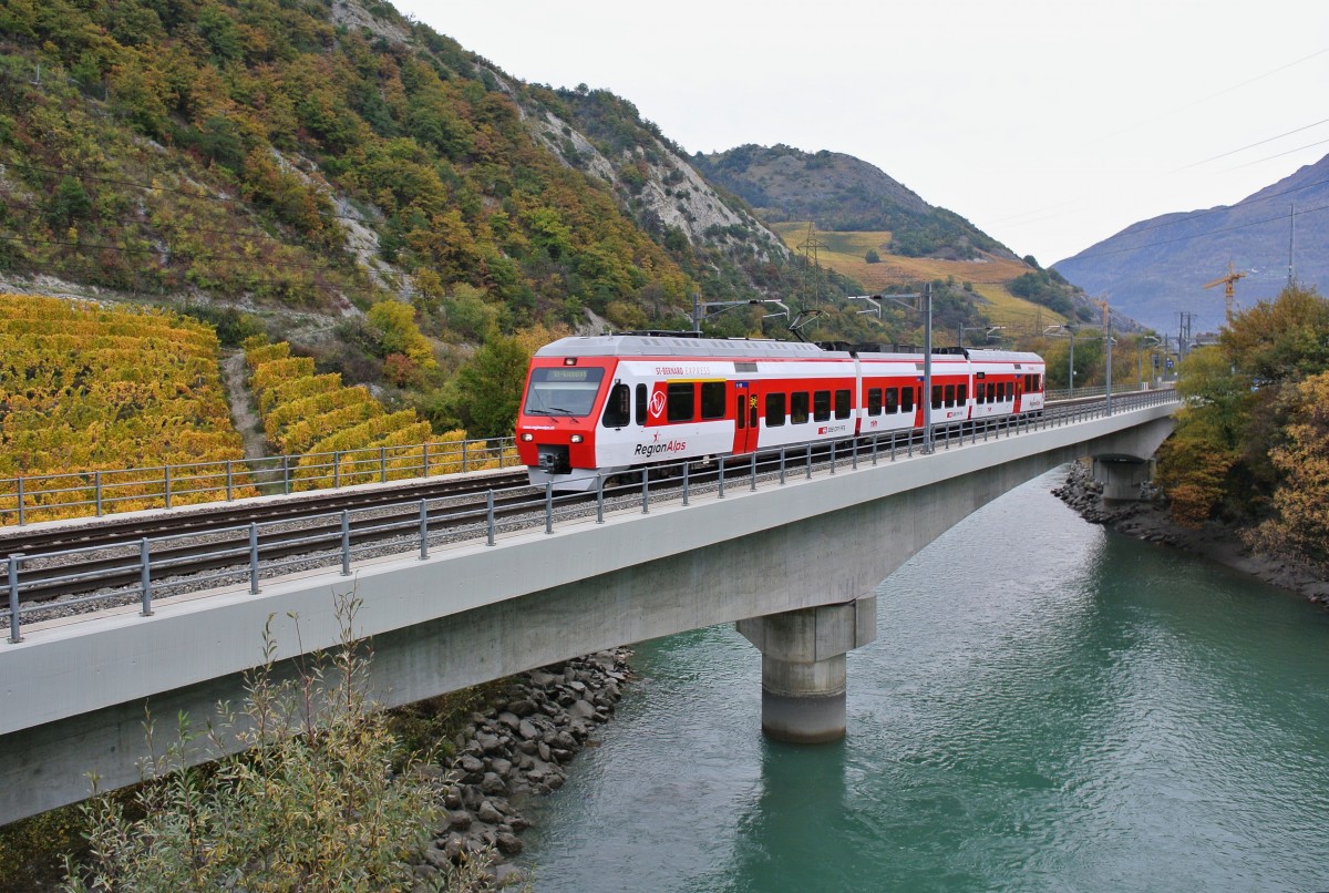 Aufgrund der Zusammenarbeit von der SBB und der TMR im Regionalnetz Region Alps verkehren z. T. die TMR NINAS bis Brig. Im Bild fährt der RABe 525 041-0 als Regionalzug 4422 von Brig nach St-Gingolph, Leuk, 01.11.2013. Simon Bütikofer