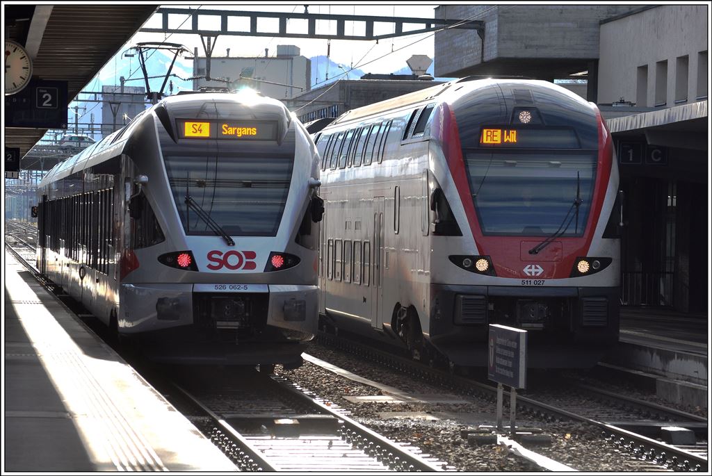 Im alten Fahrplan haben sich die REX in Buchs SG gekreuzt. Seit 15.12. kreuzen sich hier die REX mit der S4. S4 23439 526 062-5 und RE3822 511 027. (15.12.2013)
