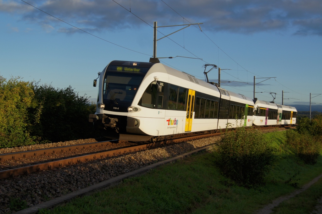 Der SBB /THURBO RABe 526 735-6 (94 85 7526 735-6 CH-THB) erreicht auf der Fahrt von Schaffhausen nach Erzingen (Baden) den Bahnhof Wilchingen Hallau; dort stehen zu meiner Freude noch Formsignale, auch wenn nicht ganz so einfach ist, diese geschickt ins Bild zu integrieren.