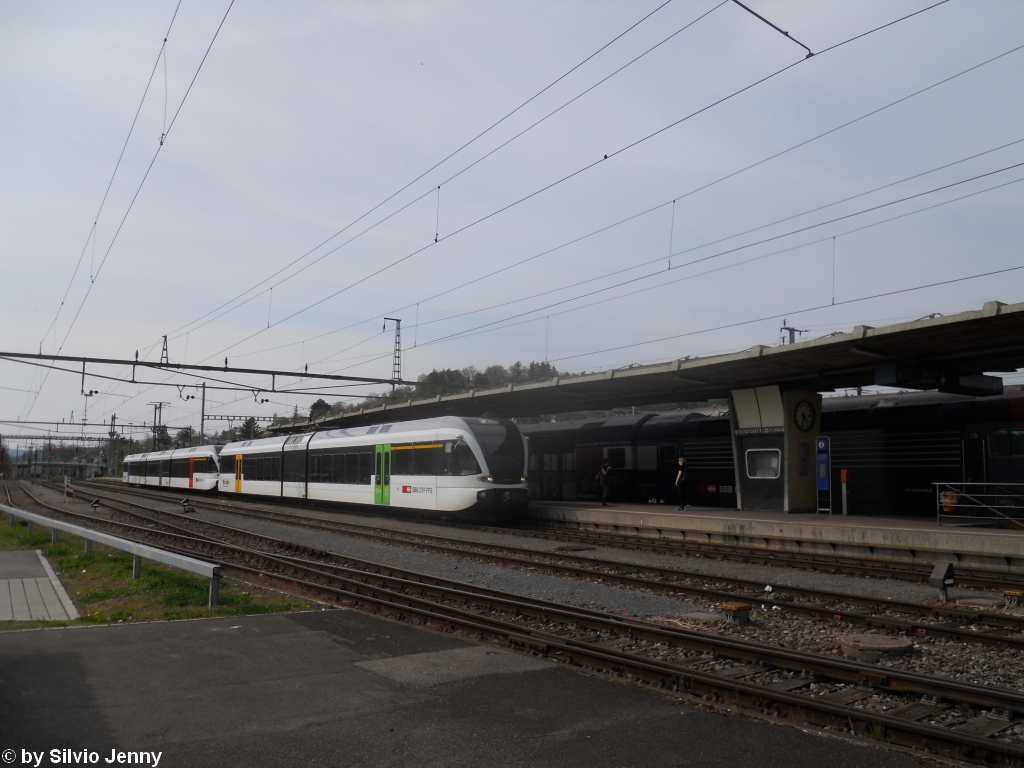 RABe 526 799-2 und 526 735-6 ''Rümikon AG'' am 6.6.2013 in Heerbrugg als S1 nach Altstätten SG. Mit der Inbetriebnahme der S-Bahn St.Gallen ab Dezember verkehrt die S1 nicht mehr ins Rheintal. An deren Stelle kommt die Ringlinie S4 der SOB zum Einsatz. Silvio Jenny