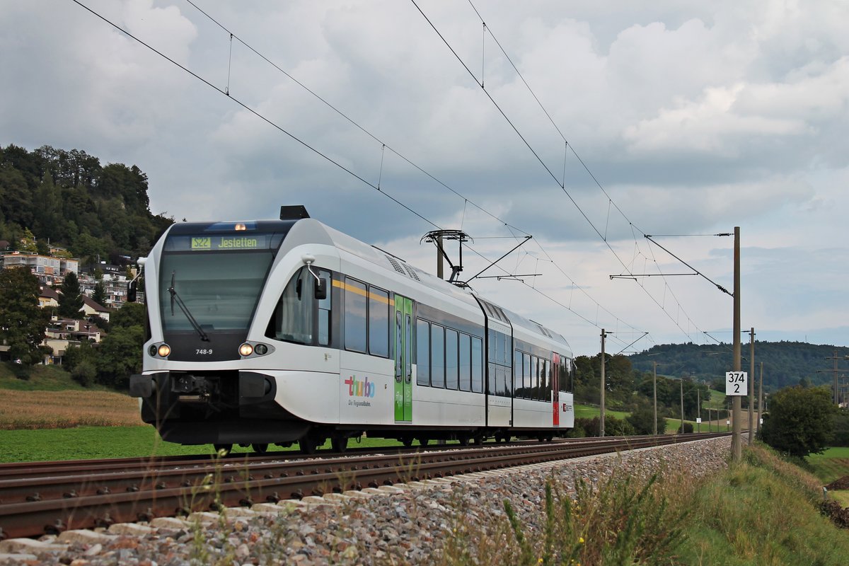 Als S22 (Singen (Hohentwiel) - Jestetten) fuhr am 20.09.2017 der  thurbo  748-9 (RABe 526 748-9) bei Thayngen über die Hochrheinbahn.