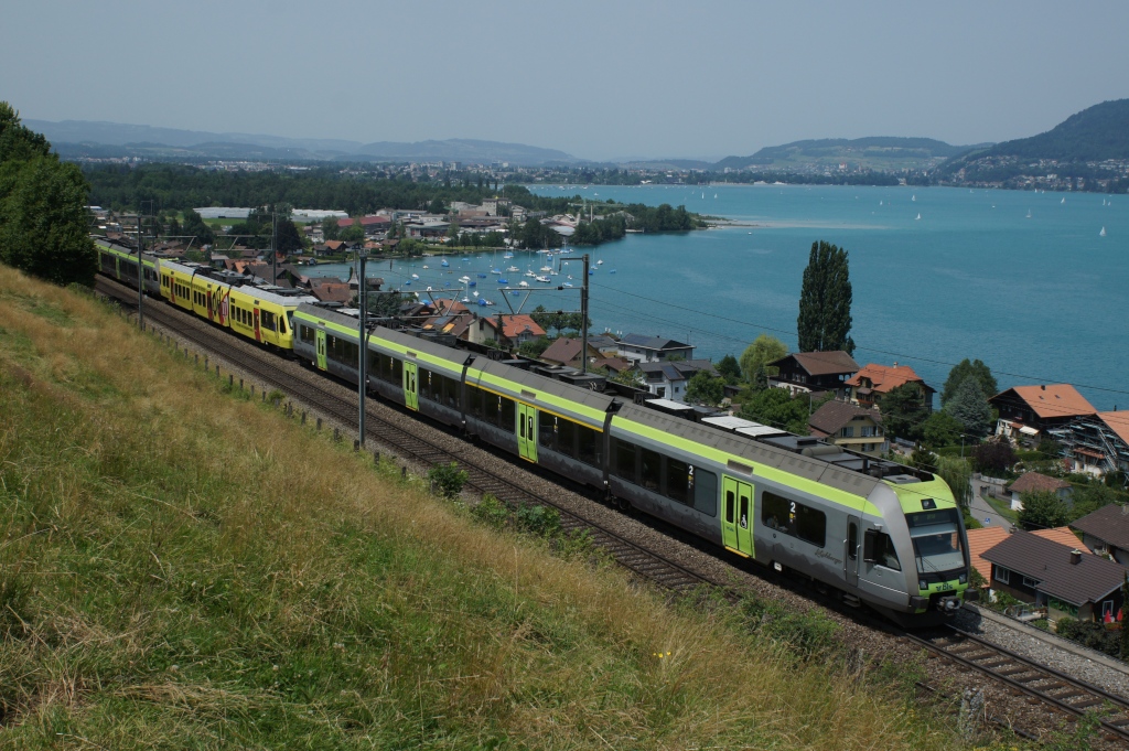 RABe 535 110-1, RABe 525 037-8 , RABe 535 118-4 und RABe 535 105-1 fahren am 30.6.12 als RE 3179 von Einigen Richtung Spiez.