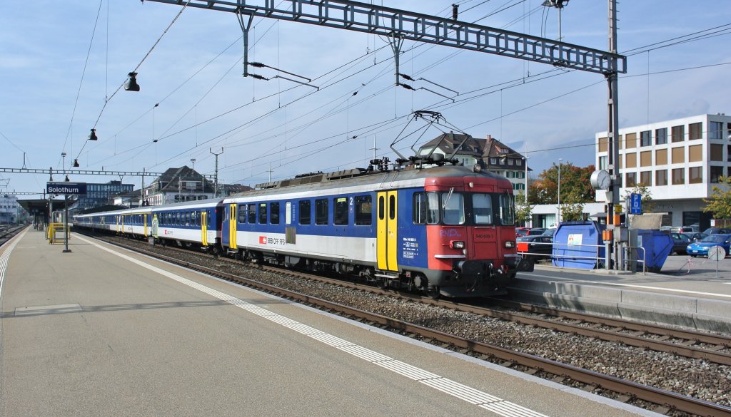 Ersatz IR 2125 bei Ausfahrt in Solothurn. Anstelle des EWIV Pendels verkehrte heute wieder einmal ein Doppel RBe Pendel nach Biel. Zuvorderst ist der RBe 540 035-3, hinten der 540 061-9, und dazwischen 6 EWI NPZ Wagen, 05.10.2012.