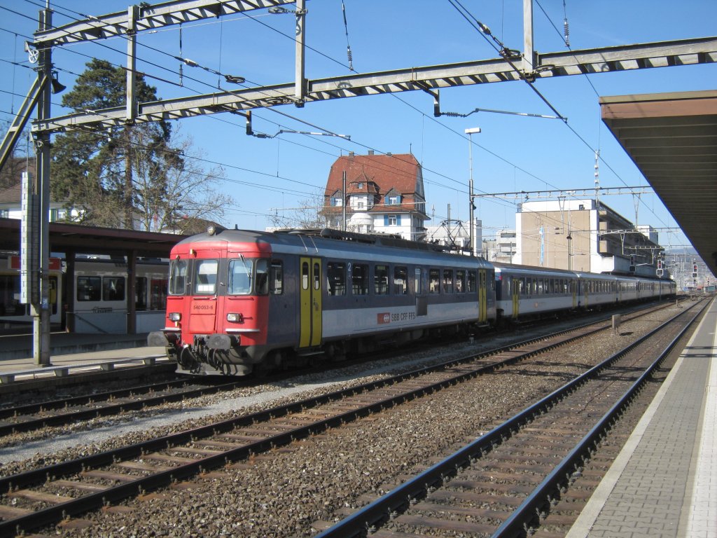 Ersatz S3 18353 in Dietikon. Anstelle eines DPZ verkehrte ein Doppel RBe Pendel mit 6 EWI Zwischenwagen. An der Spitze des Zuges ist der RBe 540 053-6, hinten der RBe 540 061-9, 29.02.2012.
