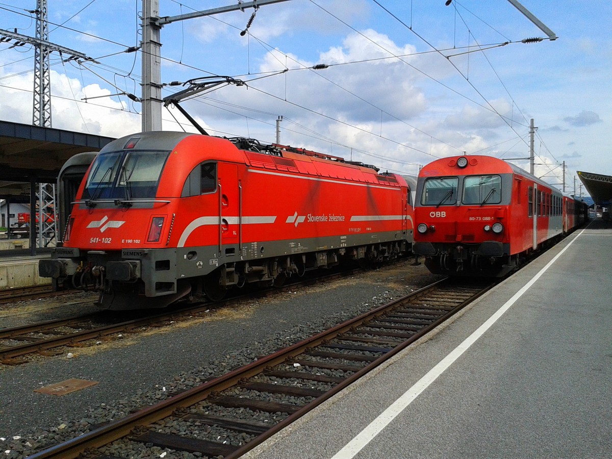 Rechts R 4845 (Villach Hbf - Arnoldstein) mit 2016 049-6 als Schiebelok und links 541 012-4 mit einem Abteilwagen der HŽ und einem Abteilwagen der SŽ. Aufgenommen am 3.9.2015 in Villach Hbf Hans-Peter Kurz
