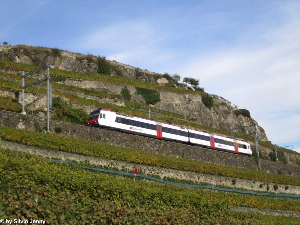 Auch in weiss/schwarz, statt gelb/blau bietet der Train de Vigne einen guten Kontrast. Hier ist am 17.10.2012 der RBDe 560 205-7 (ex. RBDe 560 012-7 ''Zwingen'') zwischen Corseaux-Corsalles und Chèxbres-Village unterwegs. Silvio Jenny