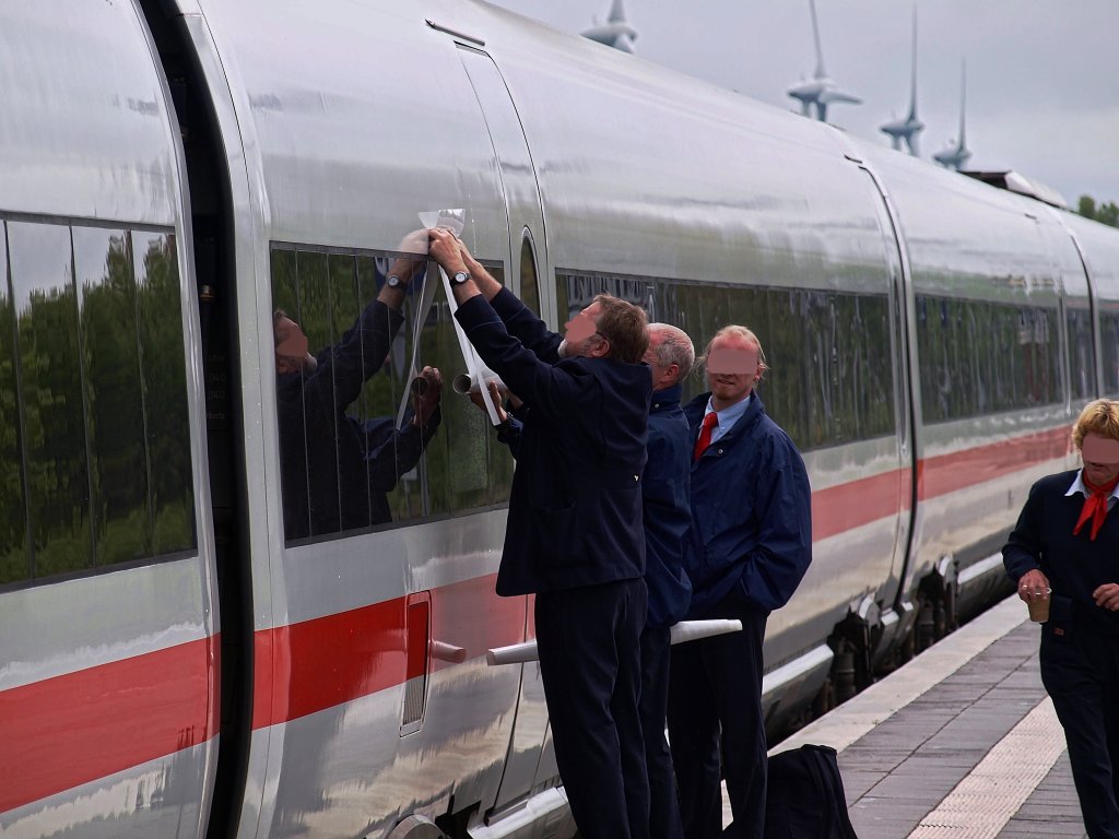 Deutsch-Dänische Zusammenarbeit. BR 605 211-1 (Diesel-ICE) hat am 24.05.2010 in Puttgarden das dänische Fährschiff "Prinsesse Benedikte" verlassen und bekommt am Bahnhof Puttgarden mit hilfe von Deutschen und Dänischen Bahnpersonal eine zerbrochene Seitenscheibe notdürftig mit einer Plastikfolie geflickt bevor es weiter nach Hamburg geht.