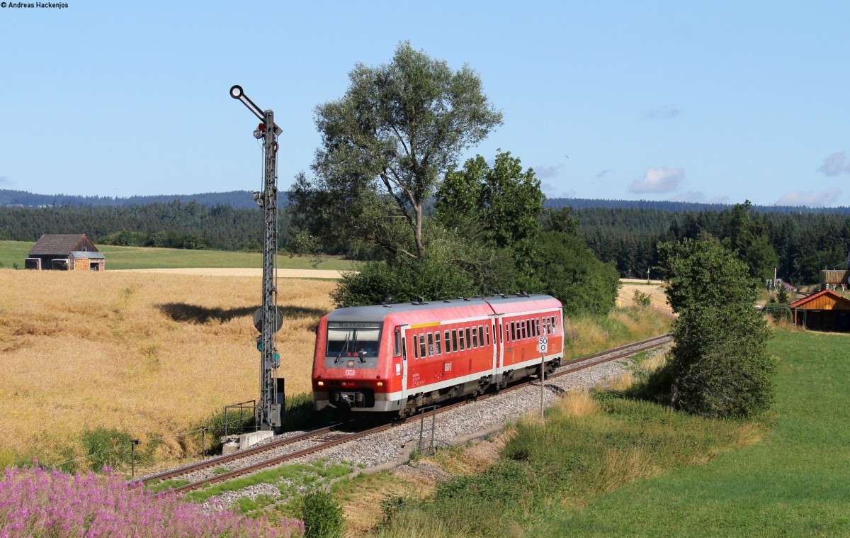 IRE 3213 (Neustadt(Schwarzw)-Ulm Hbf) mit Schublok 218 494-3 trifft auf 611 024-1 als IRE 3208 (Ulm Hbf-Neustadt(Schwarzw)) in Döggingen 30.7.16 Andreas Hackenjos
