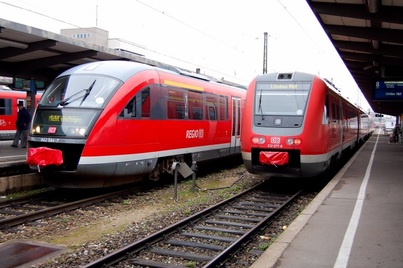 Die Stützen des Nahverkehrs in Bayrisch-Schwaben. 612 077-8 und 642 584-7 als jeweilige Vertreter ihrer Baureihe kurz vor der Abfahrt aus Augsburg Richtung Bodensee bzw. Allgäu.