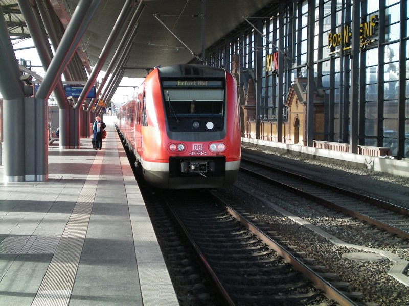 Hier 612 531-4 als RE1 (RE3659) von Göttingen nach Glauchau(Sachs) mit 612 033-1 als RE1 (RE3679) von Göttingen nach Zwickau(Sachs)Hbf., bei der Ausfahrt am 14.7.2013 aus Weimar.