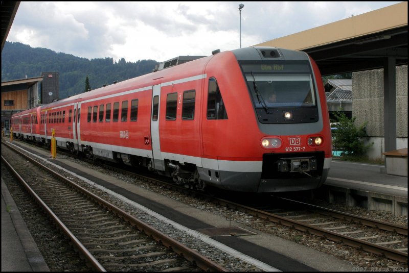 Regio-Bahn nach Ulm bestehend aus 612 577-7, 612 077-8, 612 083-6 und 612 583-5 in Oberstdorf kurz vor der Abfahrt. 30.07.2007