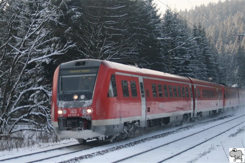 612 653-6 kämpft sich bei winterlich kalten Wetter am 6. Januar 2009 die Frankenwaldrampe hinauf. Die Aufnahme entstand kurz hinter Förtschendorf im Landkreis Kronach. Ulrich Slovig