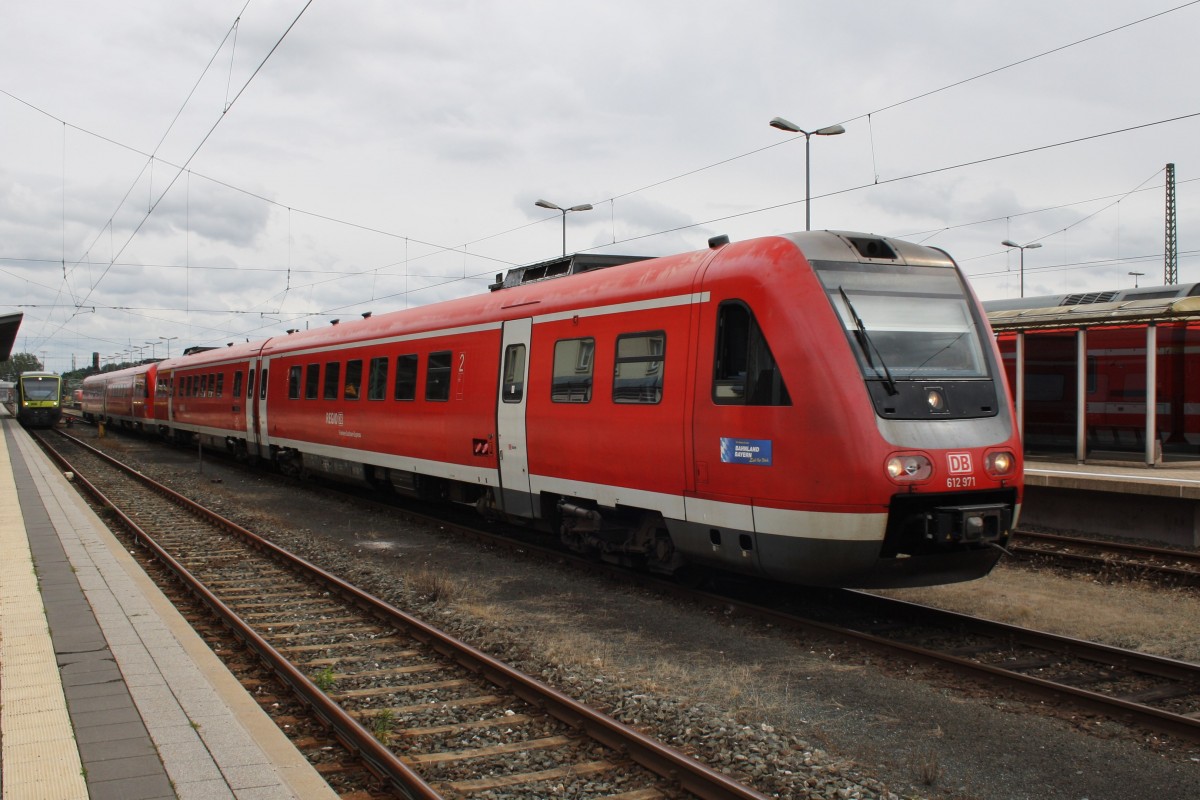 Hier 612 971-2 und 612 480-4 als RE3091 von Nürnberg Hbf. nach Hof Hbf., dieser Triebzugverband stand am 18.8.2014 in Hof Hbf.