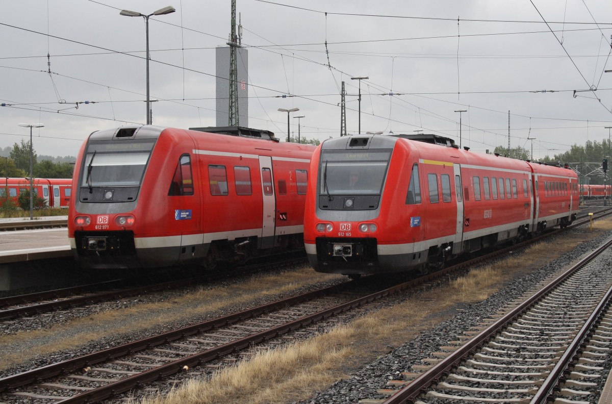 Hier links 612 971-2 und 612 480-4 als RE3697 von Hof Hbf. nach Regensburg Hbf. und rechts 612 165-1, diese Triebzüge begegneten sich am 18.8.2014 in Hof Hbf.
