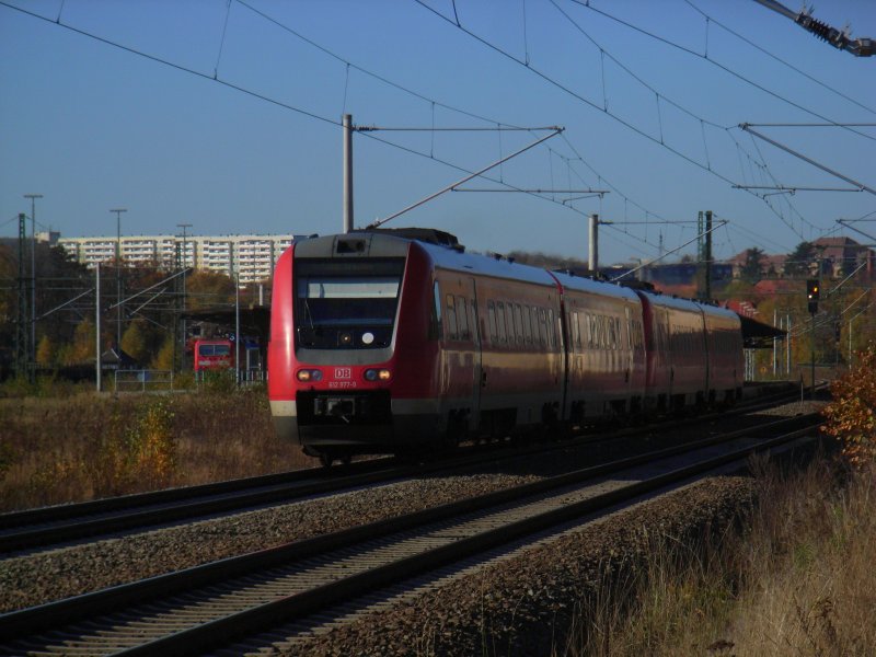 612 977-9 verlässt als IRE 3085  Franken-Sachsen-Express  von Nürnberg nach Dresden den Bahnhof Freiberg. Von hier aus wird er ohne Halt bis nach Dresden durchfahren. 24.10.08