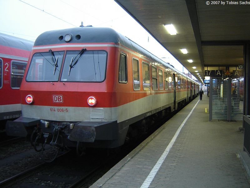 Triebzug 614 006-5 hat alte Lackierung. Ist es richtig? Er ist ein RB in Nürnberg und soll in Richtung Hersbruck sein.