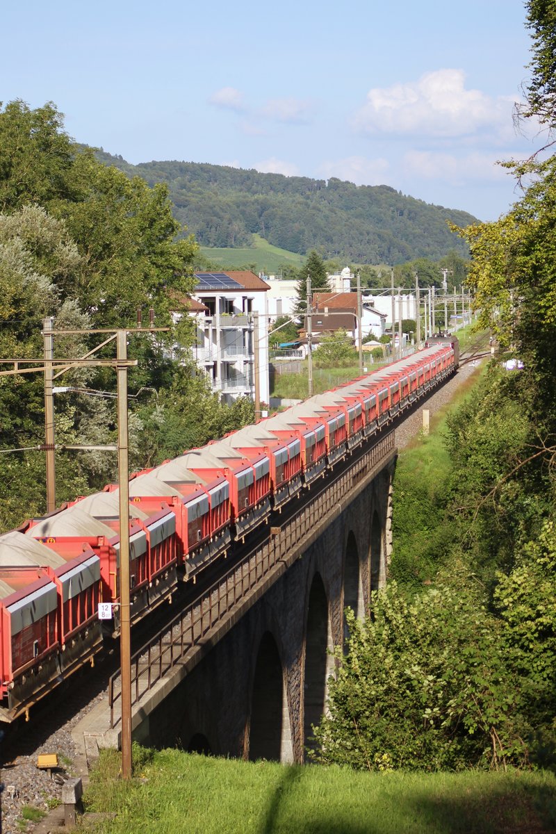 Am Montag, 21. August 2017 (18.15 Uhr)durchquert die SBB Re 620 047-8  Bex  mit einem vollbeladene Kies-Güterzug(leer) unter blauem Himmel, die 90 Meter lange Wildbachbrücke bei Rorbas, Richtung Winterthur. Der Güterzug hinterliess dabei auch eine Staubwolke.