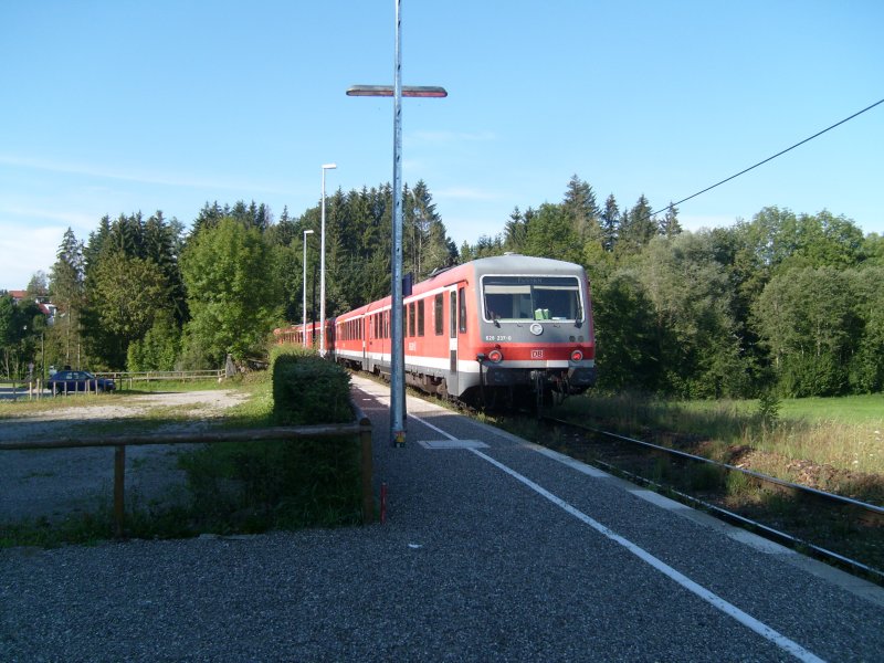 628er-Doppeltraktion mit 628 237-0 als hinterem Triebwagen bei der Ausfahrt aus Leuterschach Richtung Füssen, August'07