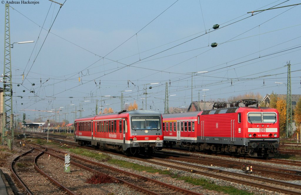 628 251-1 als RB 33589 (Würzburg Hbf-Bad Mergentheim) dieselt gerade an 143 900-0 in Lauda vorbei 01.11.09