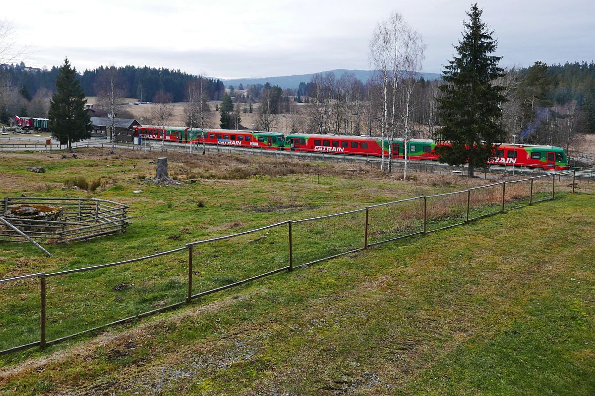 Als Os 8105 von České Budějovice kommend haben 628 313-9 'PETRA' mit 95 80 0628 276-8 D-GWTR und 628 261-0 mit 628 283-4 'GAGARIN' den nächsten Halt, Stožec erreicht (31.12.2019). Jürgen Vos