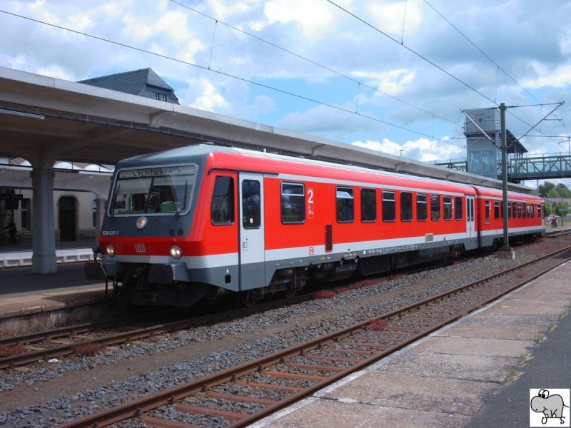 Aufgrund von Brückenbauarbeiten am 16/17 Juni 2007 zwischen Lichtenfels und Ebersdorf bei Coburg wurde zwischen Ebersdorf und Sonneberg ein "Inselverkehr" mit der BR 628 eingerichtet. Kurz vor der Abfahrt nach Ebersdorf steht 628 430-1 am 16 Juni 2007 im Bahnhof von Sonneberg / Thüringen. Ulrich Slovig